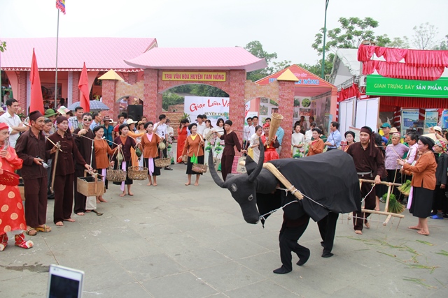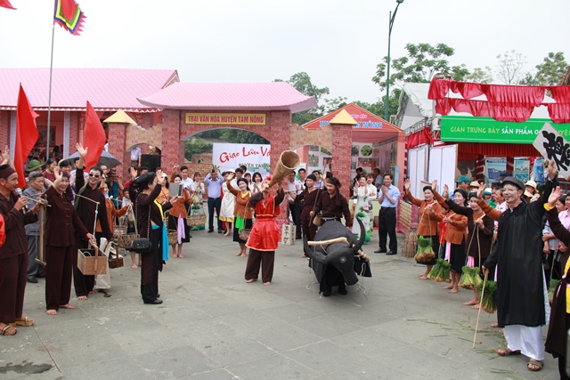 | Hát và múa phụ họa cảnh trâu cày đồng ruộng tại trại văn hóa huyện Tam Nông. |