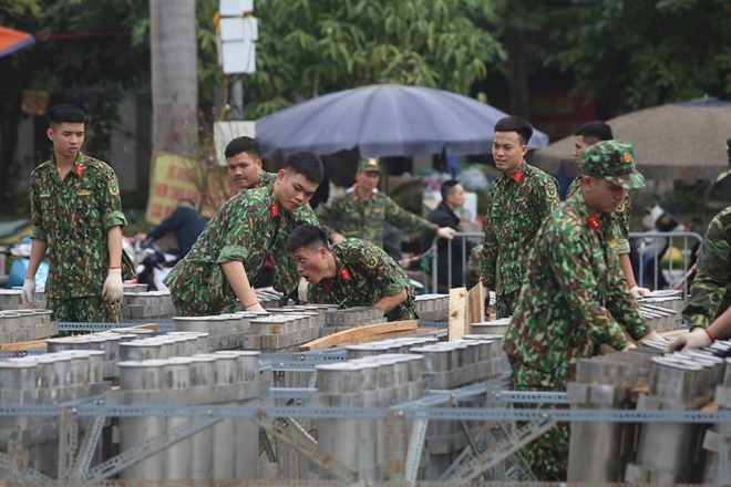 | Các chiến sĩ bộ đội tiến hành lắp đặt ống phóng pháo hoa tại một điểm bắn tại vườn hoa Lạc Long Quân bên bờ hồ Tây. |