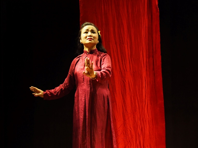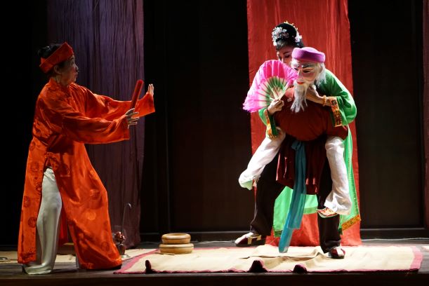 | Nghệ sĩ Minh Gái đang trình bày nghệ thuật tuồng Hồ Nguyệt Nga hóa cáo |