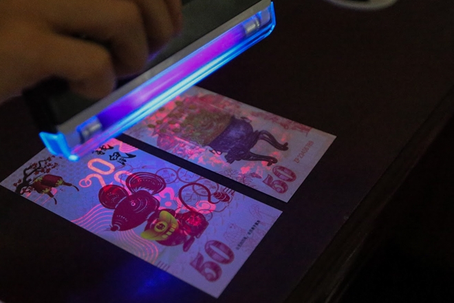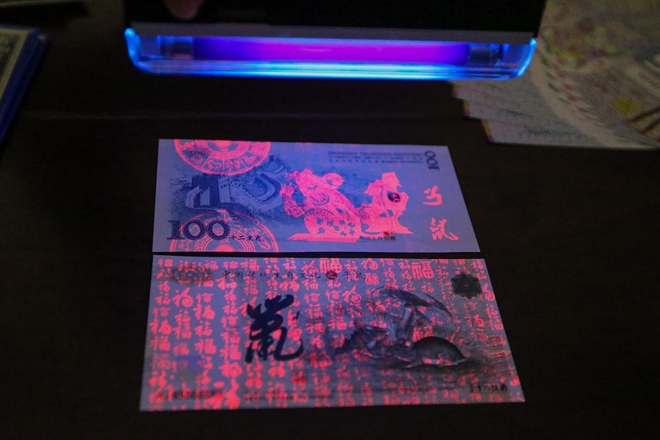 2 tờ tiền lưu niệm của Macao khi soi dưới đèn cực tím của máy soi tiền sẽ có hàng trăm ký tự phát sáng để giúp người mua tránh mua phải hàng giả.
