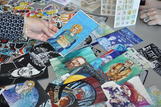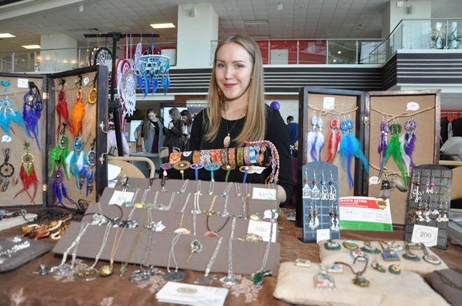 | Một sinh viên Nga bên gian hàng bán đồ lưu niệm. |