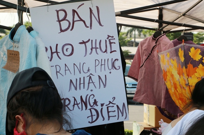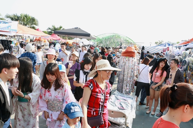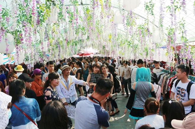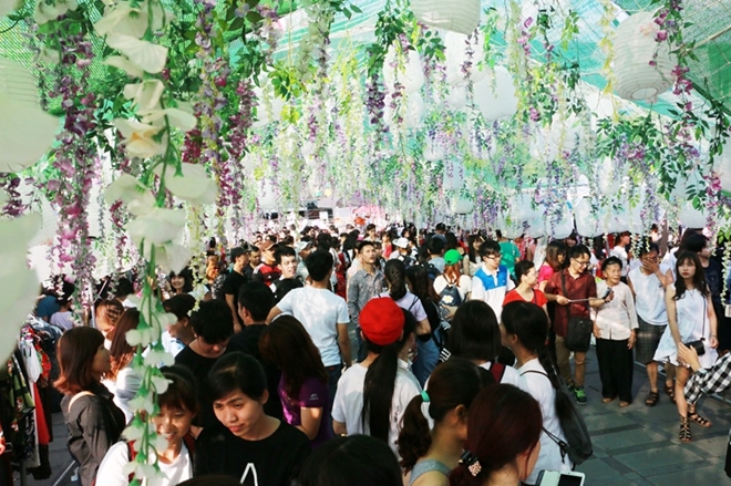 Các gian hàng  và biển quảng cáo bủa vây dọc hai bên đường hoa.