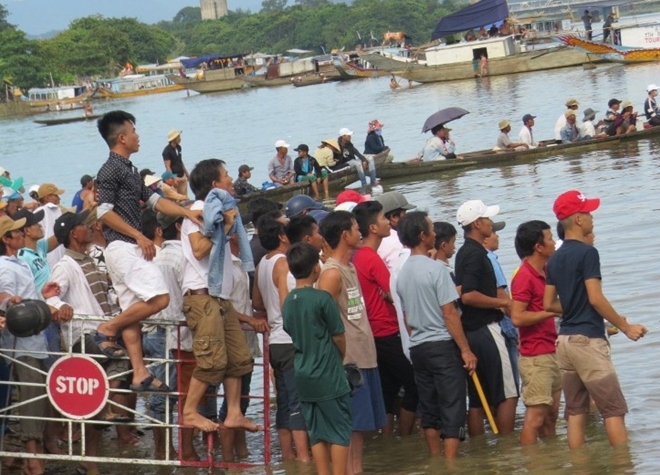 | Đông đảo khán giả đứng cổ vũ cho các đội đua bên bờ sông Hương. |