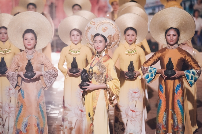 Bộ áo dài màu vàng họa tiết rồng phượng đến từ NTK Việt Hùng đã giúp Mỹ Linh toát lên vẻ đẹp quyền lực và xuất sắc tái hiện lại bài múa dâng trầm đầy ý nghĩa đến từ xứ sở trầm hương này.