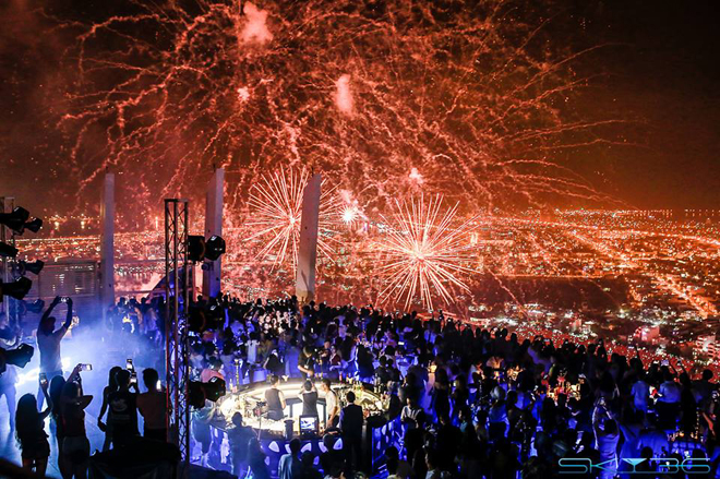 Đây là góc ngắm pháo hoa từ Sky 36 - bar cao nhất Đà Nẵng trên tầng 36 của khách sạn. Từ đây, bạn có cảm giác mình được chạm tay vào những bông pháo đang bung nở trên bầu trời đen thẫm.