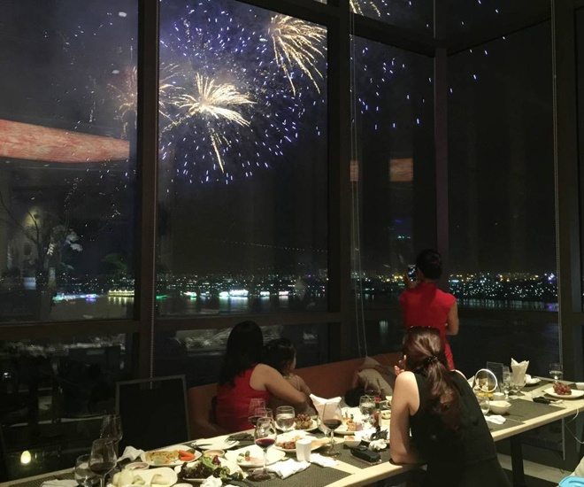 Bên ngoài khung cửa kính của nhà hàng The Square, những bông pháo hoa rơi rơi như thể những bông tuyết mùa đông. Phong cách ngắm pháo hoa lãng mạn này hẳn là chỉ Novotel Danang Premier Han River mới có thể đem lại cho bạn.