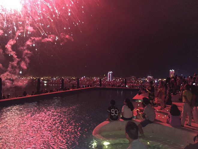 Còn ở khu vực bể bơi ở tầng 4, pháo hoa như thể đang rơi trên mặt nước bể bơi trong veo. Khỏa chân xuống nước, tận hưởng pháo hoa trên bầu trời, và phía xa kia Đà Nẵng cũng đang lấp lánh biển sao hòa cùng những sắc màu pháo hoa, khung cảnh ấy chắc chắn ít điểm ngắm pháo hoa nào có được.