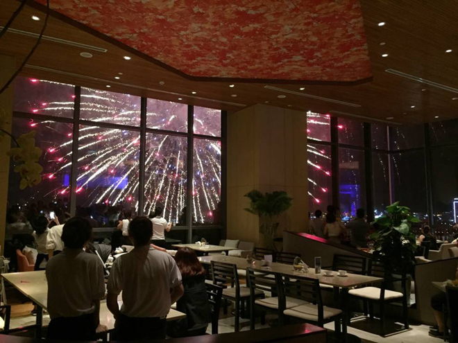 Pháo hoa bung nở trước mắt. Khuôn viên khung cửa kính này giống như một màn hình khổng lồ sống động với những màn trình diễn pháo hoa đỉnh nhất.