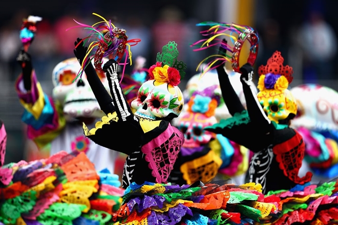 Dia de los Muertos được dịch ra là "Lễ hội người chết", đây là một lễ hội mang đặc trưng văn hóa của Mexico nhằm mục đích tưởng nhớ những người đã ra đi. Người Mexico tin rằng đầu tháng 11 là thời khắc cánh cổng chuyển giao hai cõi âm dương sẽ mở ra đưa linh hồn về với một cuộc đời khác, đó là lý do họ chọn tổ chức lễ hội dành cho người chết vào khoảng mùng 1,2 tháng 11. Ảnh: Getty