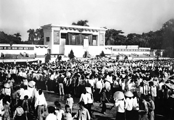 | Hình ảnh Quảng trường Ba Đình và biển người lặng trong nước mắt do nghệ sĩ Hữu Cấy ghi lại 49 năm trước. |