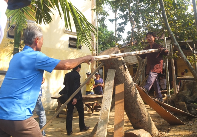 Những khối gỗ lớn được xẻ ra để bắt đầu đẽo mộc. |