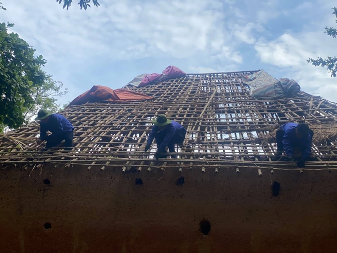 | Nhóm thợ gia cố lại mái nhà |