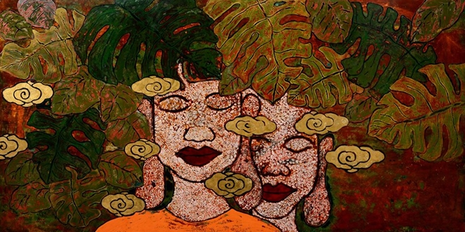 Cũng là sơn mài nhưng Trịnh Vũ Hiếu lại có kiến giải khác, chỉ sử dụng họa tiết và hình tượng nhỏ để khái quát hình ảnh của đời sống dân gian. Đậm đặc trong tranh và trên gốm của anh là những tàu lá chuối bao bọc khuôn mặt Phật cách điệu.