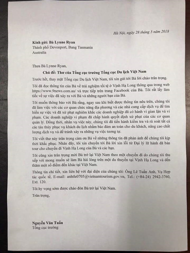 Trong lá thư, ông Tuấn cho biết, ông đã đọc thông tin của bà Lynne Ryan về trải nghiệm tồi tệ ở Vịnh Hạ Long trên trang web nước ngoài, trang facebook cá nhân của bà là rất lấy làm tiếc về sự việc này đã xảy ra.
