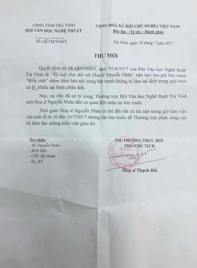 Sau khi phát hiện đây là bức tranh sao chép một bức tranh đăng trên báo, Hội Văn học nghệ thuật Trà Vinh đã thu giữ bức tranh theo quyết định ngày 1-6-2017.