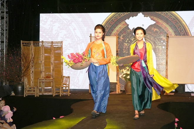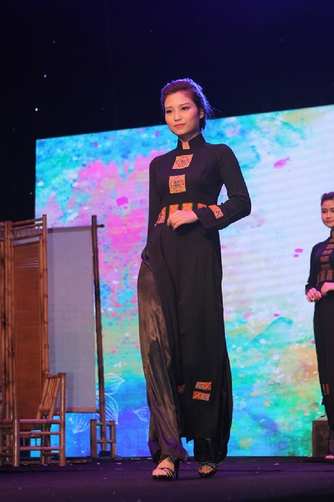 | Nét độc đáo của bộ sưu tập Áo dài xưa và nay là sự kết hợp giữa yếu tố truyền thống và vùng miền. Những chiếc áo dài được pha trộn với trang phục truyền thống của Tây Nguyên đã mang đến cho khán giả nhiều xúc cảm mới lạ. |