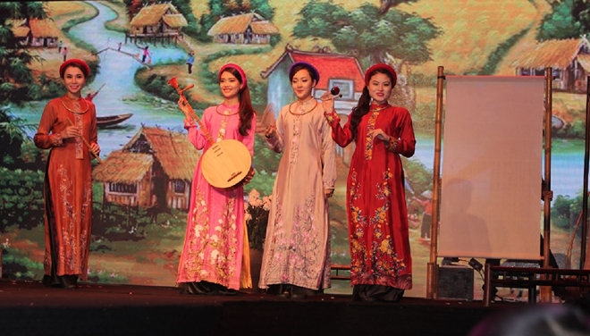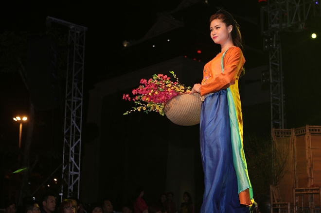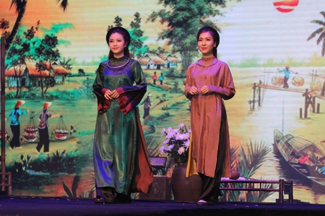 | Buổi diễn cũng giới thiệu vẻ đẹp nữ phục Việt cổ truyền là những chiếc áo tứ thân duyên dáng, mềm mại –một trang phục phổ biến của phụ nữ Viêt trước thế kỷ 19. |