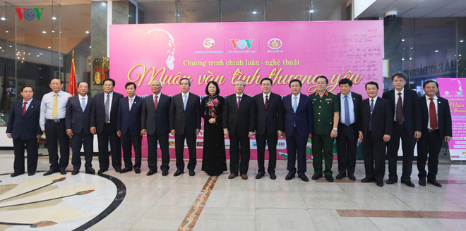 | Lãnh đạo Đảng, Nhà nước cùng Ban Giám đốc Đài Tiếng nói Việt Nam và các đại biểu dự chương trình “Muôn vàn tình thương yêu” tại điểm cầu Hà Nội. |