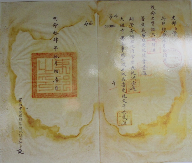 Bản phiến lục của Bộ lại xin dấu của ấn “Sắc mệnh chi bảo” đóng vào các đạo ban chiếu văn, năm Minh Mạng thứ 14 (1833). |