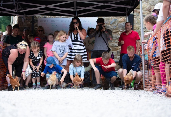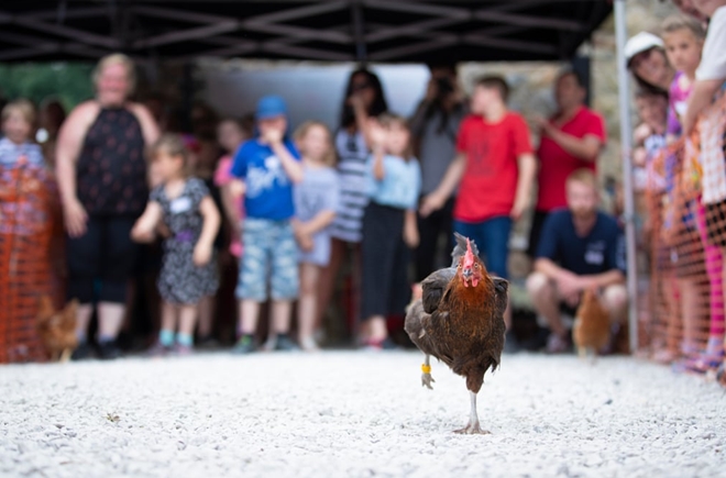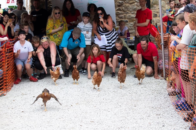 Một cô gà đang nỗ lực giành lấy vị trí thứ nhất trên đường đua. Mỗi năm, có khoảng 30 - 40 con gà chạy nhanh nhất thế giới so tài ở đây. Khi đua, gà phải đặt hai chân trên vạch khởi động và không được phép mổ đối thủ.