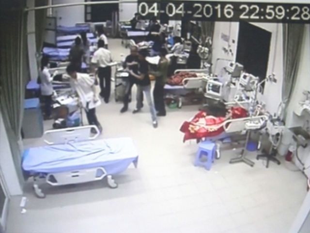 | (Ảnh camera ghi lại): Tuấn "tôm" cùng đàn em truy sát anh D. tại Bệnh viện Thái Nguyên. |