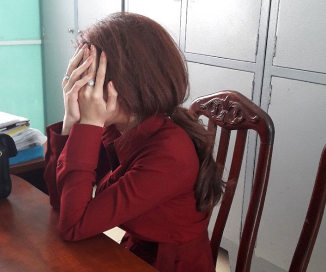 | Phạm Thị Thanh Hiền che mặt khi bị chụp ảnh. |