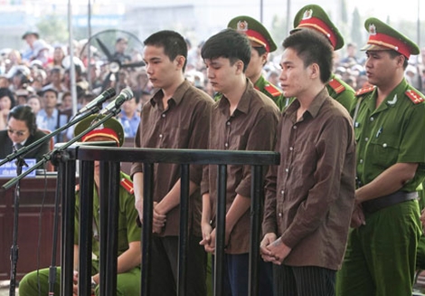 Ngay sau đó, phiên tòa trở nên ồn ào hơn khi chứng kiến ba bị cáo Nguyễn Hải Dương (24 tuổi, thường trú An Giang, ngụ huyện Hóc Môn, TP Hồ Chí Minh), Vũ Văn Tiến (25 tuổi, ngụ Bình Phước, tạm trú huyện Hóc Môn) và Trần Đình Thoại (27 tuổi, thường trú Vĩnh Long, tạm trú quận 12) được Cảnh sát dẫn giải đến tòa. Nhiều người đã cố gắng để nhìn cho rõ gương mặt và hình dáng của cả ba bị cáo.