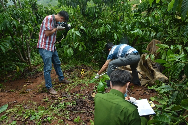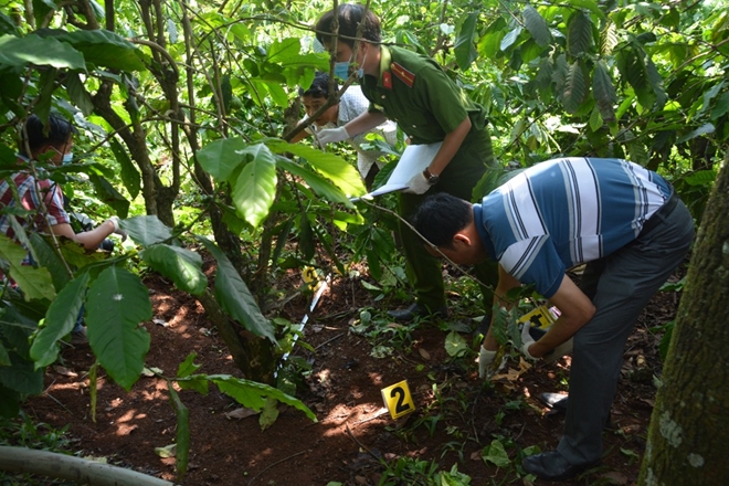 Tiếp đó, từ ánh sáng của đèn pin, các cán bộ Công an phát hiện ra nhiều vết máu sót lại trên một ống dẫn nước tưới cà phê, bên cạnh một gốc cây bơ to phía sau căn nhà cấp 4 của bà Nghiêm Thị Nhi.