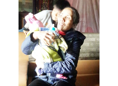 | Bà Mạc Thị Hường bế đứa cháu tội nghiệp. |