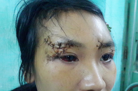 | Những vết thương trên mặt và đầu khiến chị Hiền phải khâu nhiều mũi. |