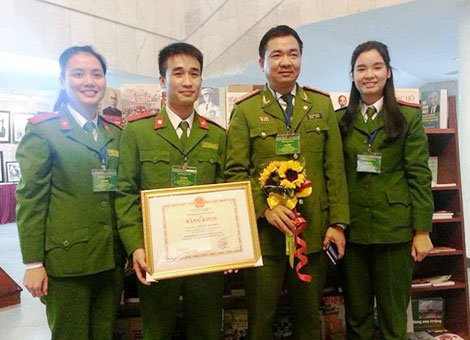 | Nhóm sinh viên Cảnh sát nhân dân giành giải nhất và thầy hướng dẫn tại lễ trao giải Tài năng khoa học trẻ 2014. |
