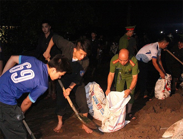 | CA Chương Mỹ cùng 100 học viên Trung cấp Cảnh sát vũ trang khẩn trương đóng và vận chuyển những bao cát để gia cố đê sông Bùi |