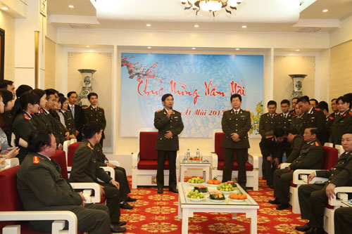 | Thiếu tướng Trần Gia Cường, Cục trưởng Cục Đối ngoại báo cáo công tác trực ban, trực chiến trong dịp Tết. |