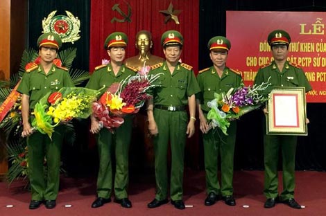 | Trung tá Lê Xuân Minh (ngoài cùng bên trái) nhận thư khen của Chủ tịch nước. |