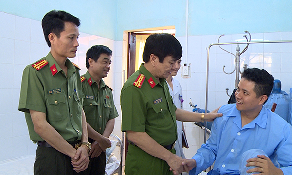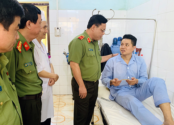 | Thiếu tướng Nguyễn Hải Trung, Giám đốc Công an tỉnh thăm, động viên đồng chí Lê Thế Anh |