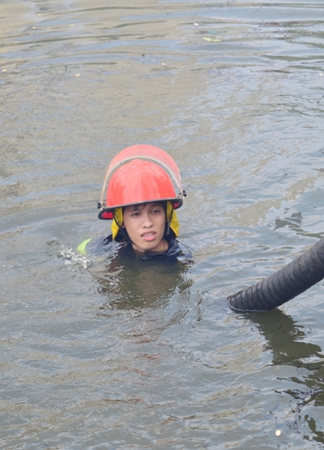 Do hồ nhiều bùn, một chiến sĩ phải nhảy xuống giữ đầu vòi hút không cho chìm xuống bùn.