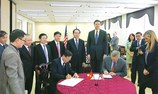 | Bộ trưởng Trần Đại Quang và Ngài James Comey, Giám đốc Cơ quan Điều tra Liên bang Hoa Kỳ (FBI) chứng kiến lễ ký Thư thỏa thuận về việc Cơ quan Điều tra Liên bang Hoa Kỳ chuyển giao phần mềm giám định gen ADN cho lực lượng Cảnh sát Việt Nam. |