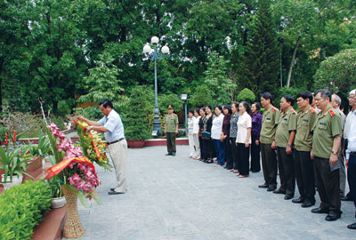 | Cựu SV D1 dâng hương trước tượng đài Bác Hồ tại Học viện ANND. |
