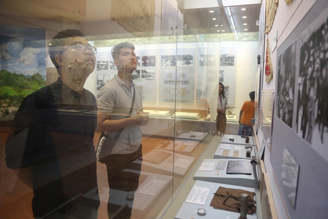 | Các bạn trẻ chăm chú quan sát hình ảnh, hiện vật về lực lượng CAND trong giai đoạn kháng chiến chống thực dân Pháp xâm lược. |