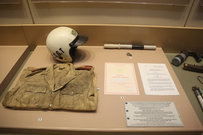 | Tại Bảo tàng cũng có trưng bày bộ quần áo được sử dụng bởi đồng chí Đồng Văn Sự, chiến sĩ CSGT tỉnh Hải Dương trước khi đồng chí hi sinh vào ngày 12-9-2001. |