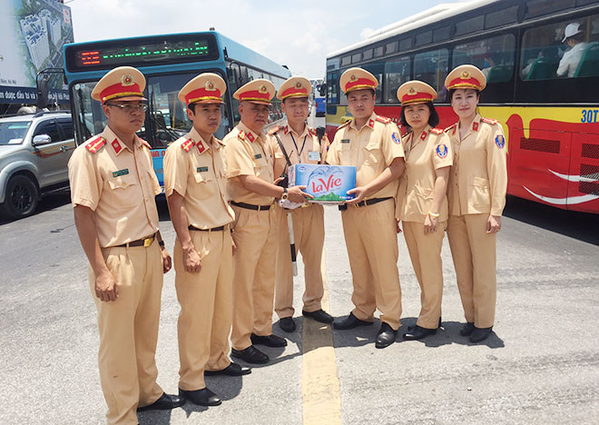 | Đại tá Đào Vịnh Thắng động viên và tặng nước cho cán bộ, chiến sỹ CSGT làm nhiệm vụ trong nắng nóng. |