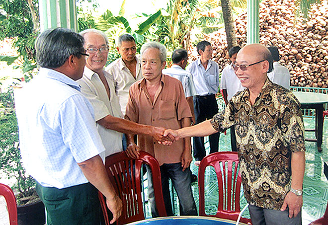 | Tác giả (bìa phải) trở lại Bến Tre thăm đồng đội ngày 30-4-2012. |