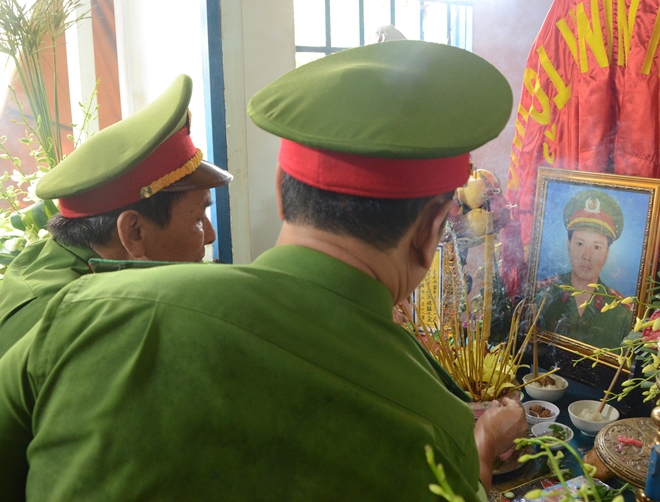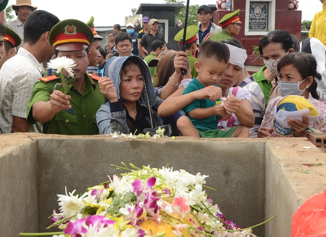 Chị Phượng, vợ đại úy Long một tay bế đứa con trai 2 tuổi, một tay cầm bài vị của chồng, mắt đỏ hoe. Gương mặt đau buồn nhưng dường như chị không thể khóc trước nỗi đau quá lớn. Đứa con trai 2 tuổi trên tay giơ tay chỉ về hướng quan tài của Đại úy Long kêu khóc. Dường như bé linh cảm người cha quả cảm của mình sẽ không còn ở bên, trong những ngày thơ dại của bé. Bà Mến, mẹ của Đại úy Long không thể chịu đựng được cú sốc trong đời nên đổ bệnh. Phút chia ly, người mẹ không thể đứng vững mà phải có người dìu.