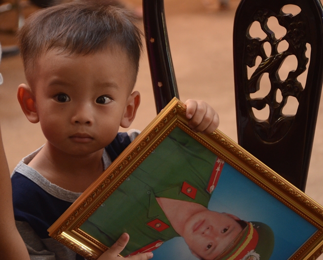 | Hình ảnh cậu con trai 2 tuổi ngơ ngác cầm di ảnh Đại úy Long khiến ai nhìn thấy cũng quặng lòng |