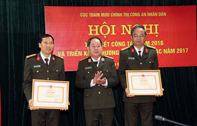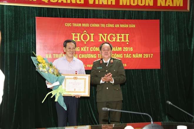 | Thừa ủy quyền của lãnh đạo Bộ Công an, Trung tướng Nguyễn Thanh Nam trao Bằng khen của Bộ Công an cho Đại tá Lê Văn Tuyến, Phó Cục trưởng Cục Tham mưu và Đại tá Bùi Sơn Hiển, Phó Cục trưởng Cục Tham mưu. |
