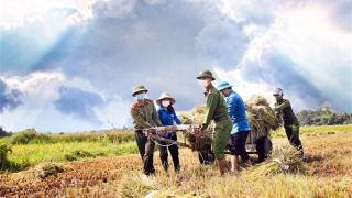 Đội nắng giúp dân thu hoạch lúa chạy bão