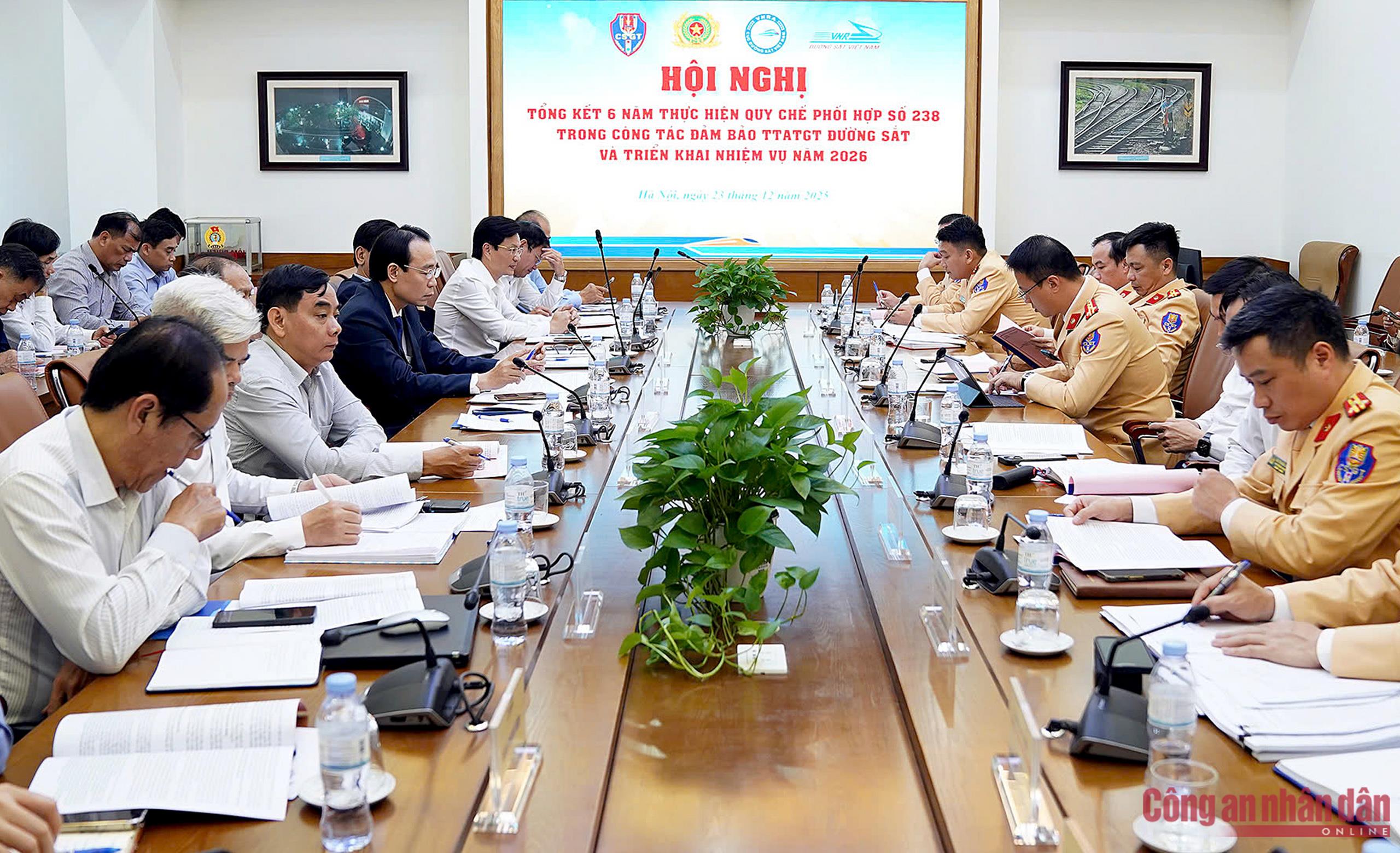 Chiều 23/12, Tổng Công ty Đường sắt Việt Nam đã tổ chức Hội nghị Tổng kết 6 năm thực hiện Quy chế phối hợp số 238/QC-LN trong công tác đảm bảo TTATGT đường sắt và triển khai nhiệm vụ năm 2026.