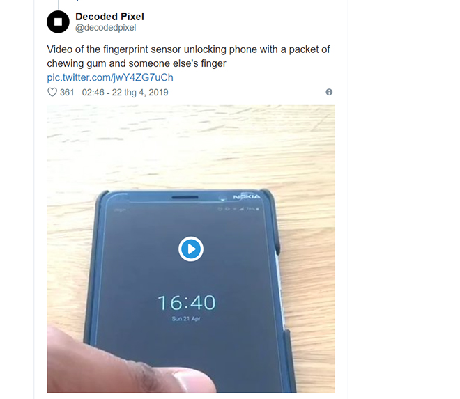 Theo thử nghiệm trên, chiếc Nokia 9 PureView được đăng ký dấu vân tay của Decoded Pixel. Tuy nhiên, thay vì sử dụng vân tay đã được đăng ký để mở máy, tài khoản Twitter này lại sử dụng dấu vân tay từ một người khác để mở máy. Trong 1, 2 lần đầu đặt ngón tay người lạ vào cảm biến, chiếc Nokia 9 PureView không mở khóa. Tuy nhiên, sau vài lần thử, cảm biến vân tay lại xác nhận và cho phép mở khoá điện thoại dù nó không đúng.
