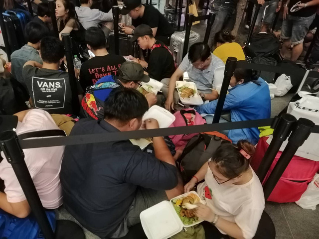 Sau khi cơn mưa dứt, tất cả trở lại ví trí chờ đợi ban đầu, nhiều người tranh thủ ăn tối lấy sức chờ đến sáng hôm sau. Ảnh: Gia Hưng