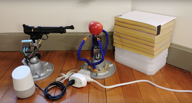 | Loa thông minh của Google nhận lệnh điều khiển ổ cắm thông minh và mở điện cho cơ chế bóp cò súng. |